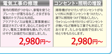 アクアテクノスでは、水道工事はもとより、電気工事・ガラス・サッシ工事・ガス工事・内装・外装工事・冷凍庫メンテナンス・各種点検業務など自社施工で行う事により間違えのない確かな技術力、中間マージンがない安心価格を実現しました。